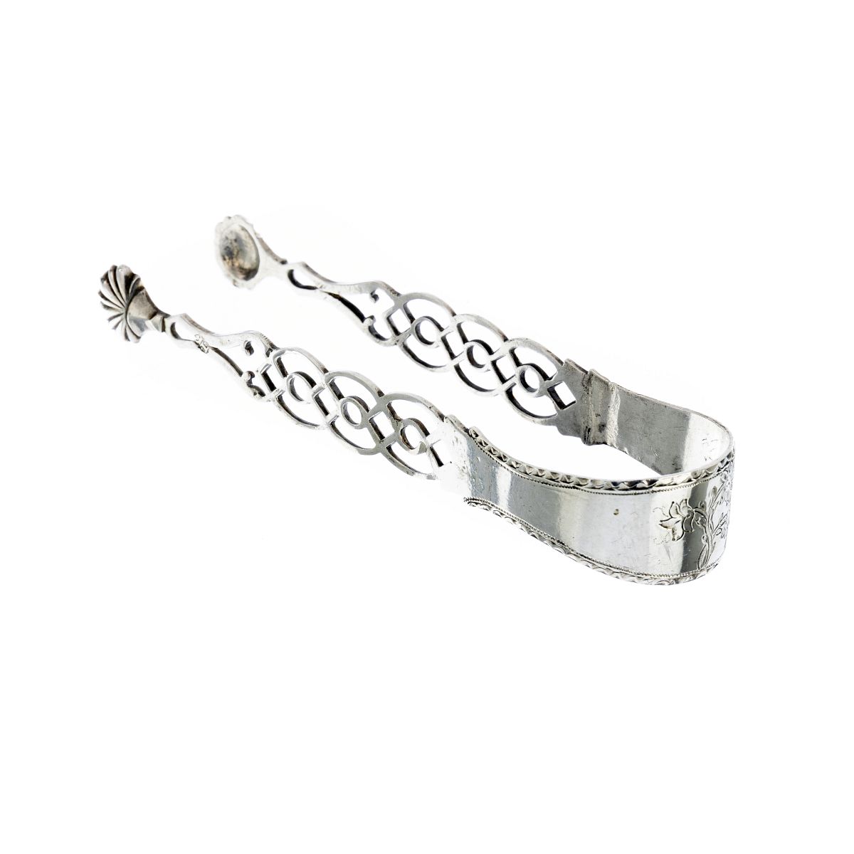 Prata portuguesa, contraste de Lisboa (1790-1795), marca de ourives não identificada, decoração vazada e relevada, com terminais em forma de concha. Sinais de uso. Peso aprox.:43,4g. Dim.:13,5cm.