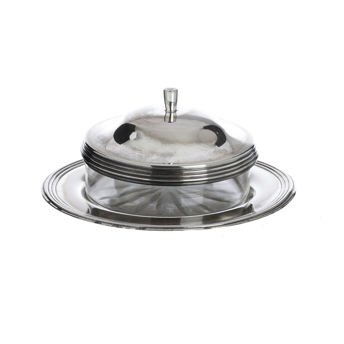 Em metal prateado, com recipiente em vidro. Sinais de uso. Dim.:15,5cm.