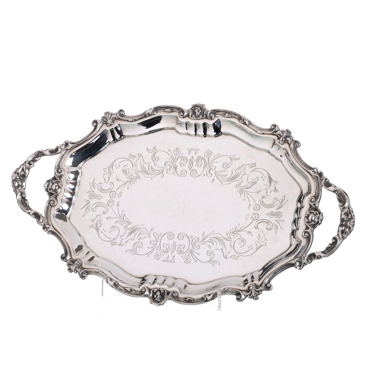 Prata espanhola, 915, contraste pentagrama, marca de ourives de 'J.Perez Fernandez', inteiror com decoração vegetalista incisa, bordo recortado e relevado de volutas. Sinais de uso. Peso aprox.:877g. Dim.:50cm.