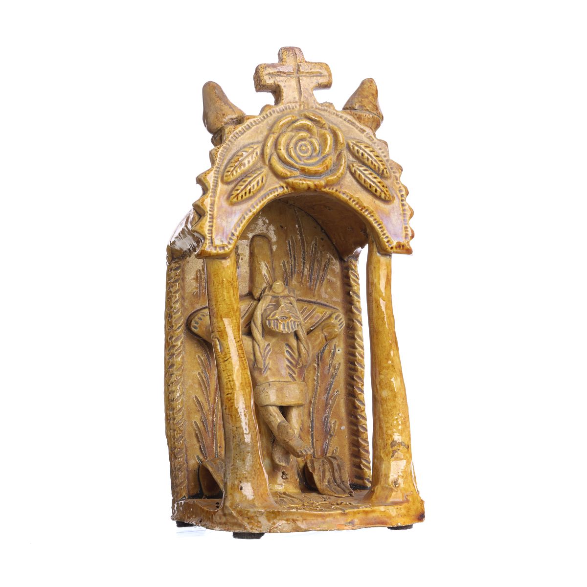 Escultura em barro popular vidrado, assinada RR. Sinais de uso. Dim.: 20 cm.