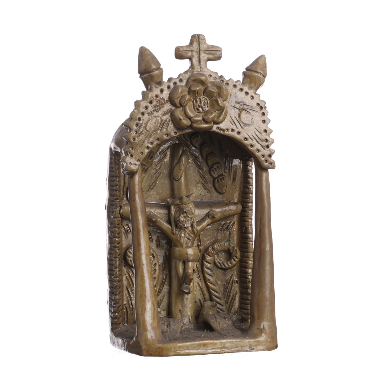 Escultura em barro popular vidrado, assinada RR. Sinais de uso. Dim.: 22 cm.