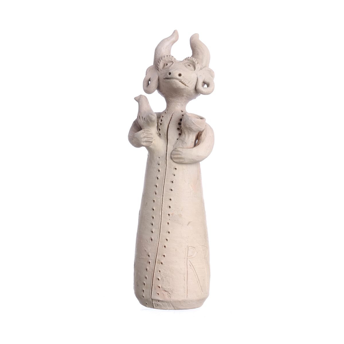 Escultura em barro popular não vidrado, assinada RR. Sinais de uso. Dim.: 30 cm.