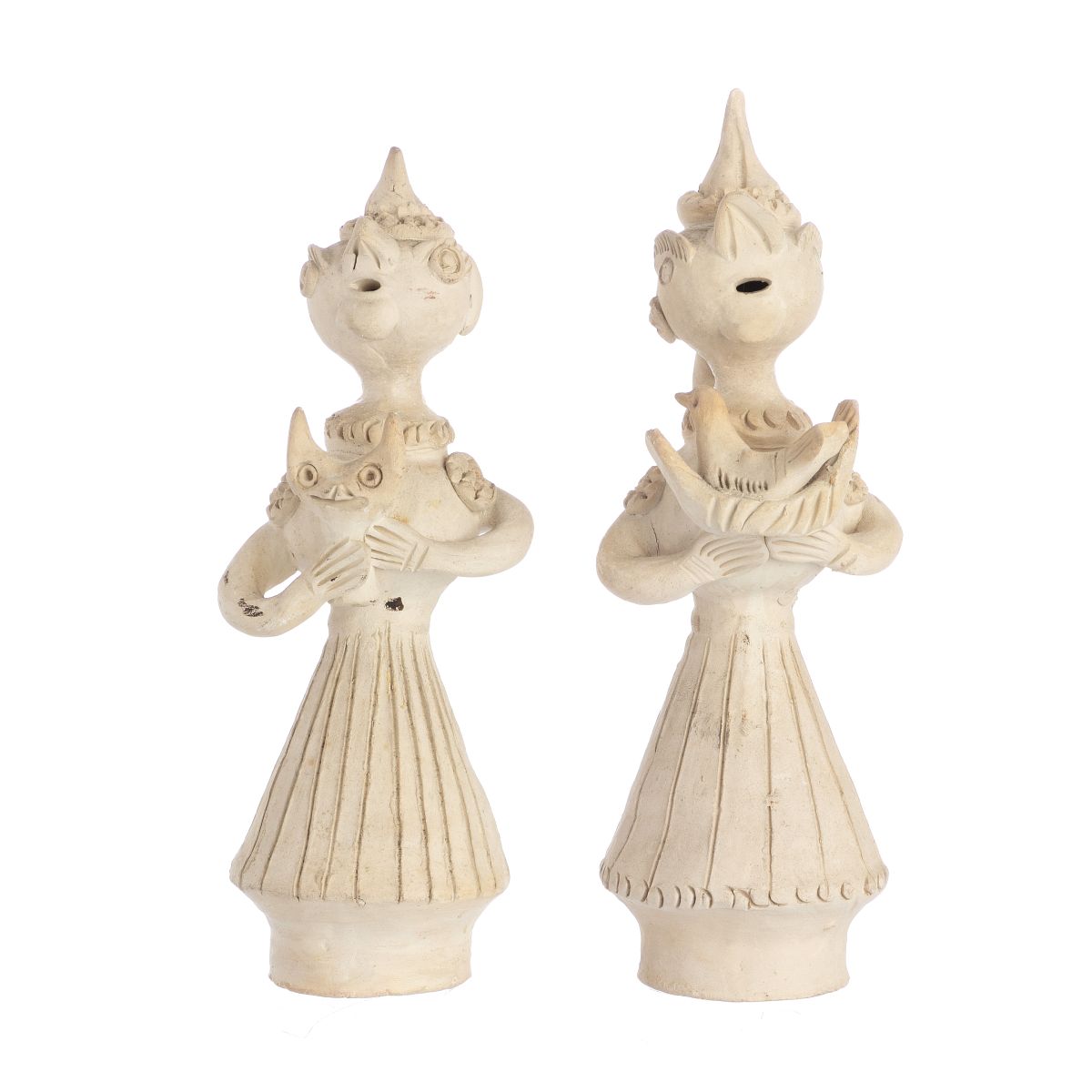 Duas esculturas em barro popular, não vidrado, assinadas JC. Pequeno restauro. Dim.: 24,5 e 26 cm.