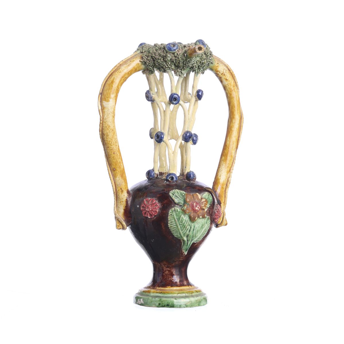 Faiança das Caldas, séc.XIX, fabrico de Manuel Mafra, decoração polícroma vidrada em alto relevo e musgo representando flores. Marca na base. Dim.: 18,5 cm.
