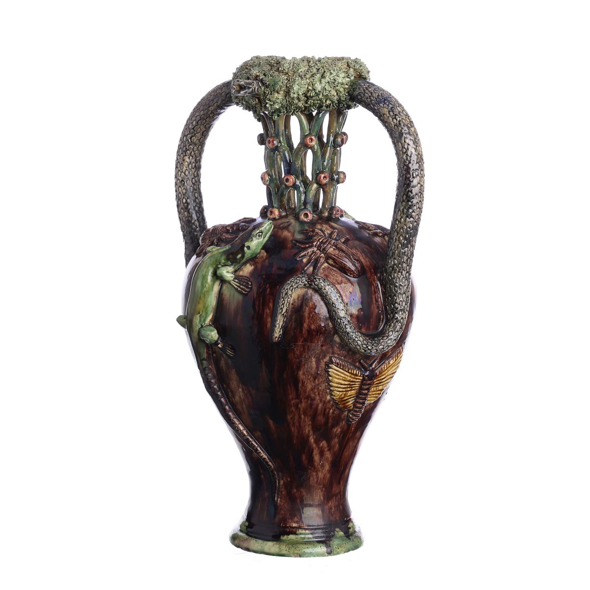 Faiança das Caldas, séc.XIX, fabrico atribuível a Manuel Mafra, decoração polícroma vidrada em alto relevo, representando lagartos e insectos, asas moldadas e bocais em forma de serpente. Mínimo restauro na asa. Dim.: 36cm.
