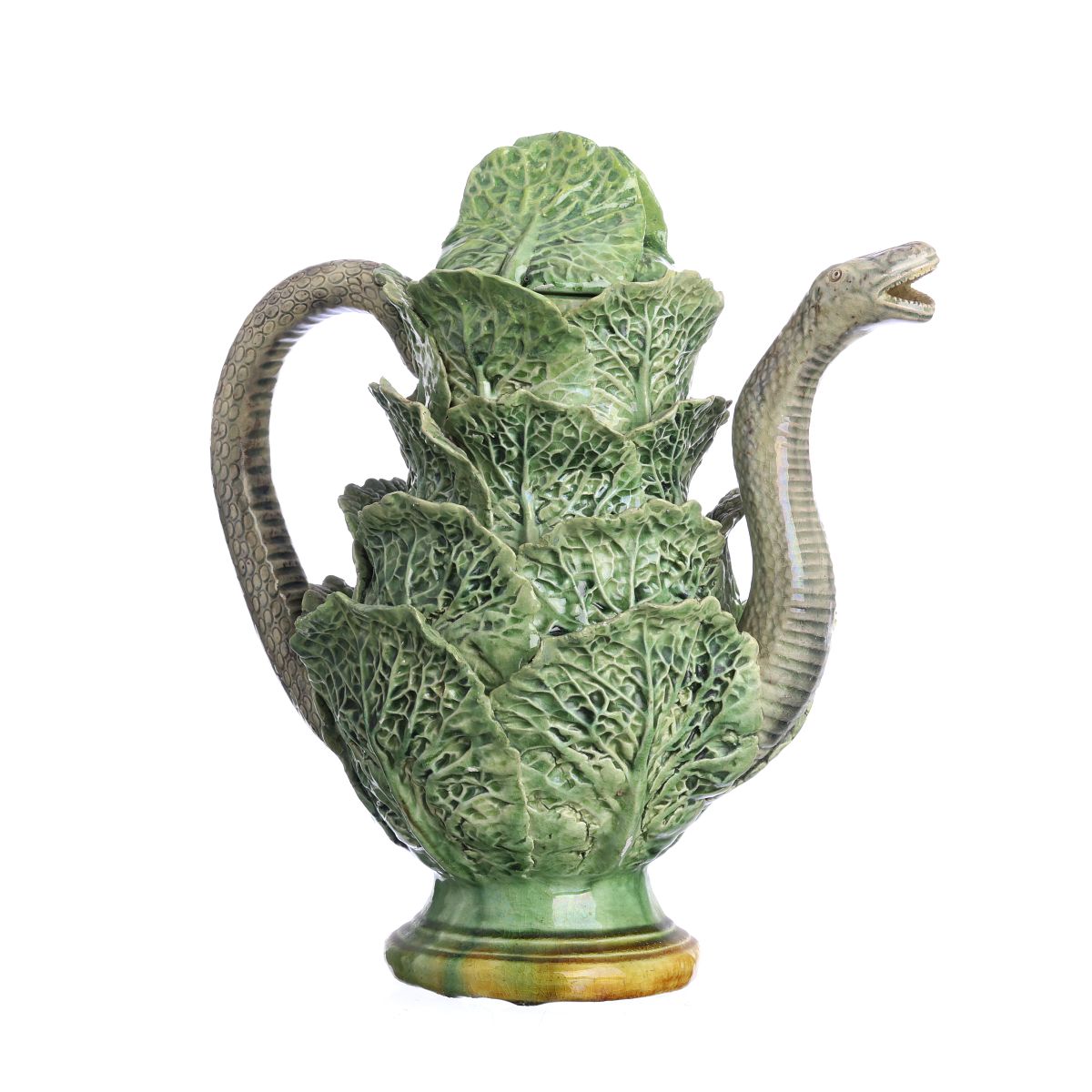 Faiança das Caldas, séc.XIX, fabrico atribuível a José A. Cunha ou Manuel Mafra, decoração polícroma vidrada em alto relevo, representando couve com serpente. Minimo restauro na tampa. Dim.: 26cm.