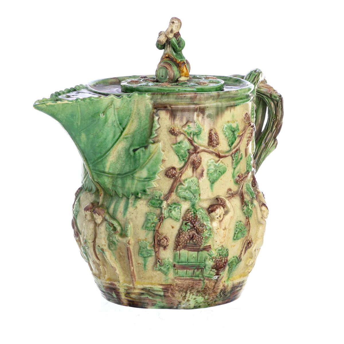Faiança vidrada das Caldas da Rainha, fabrico atribuível a José A. Cunha, séc.XIX, decoração relevada e polícroma de uva e parra com puttis, pomo da tampa figurativo. Dim.: 28 cm.
