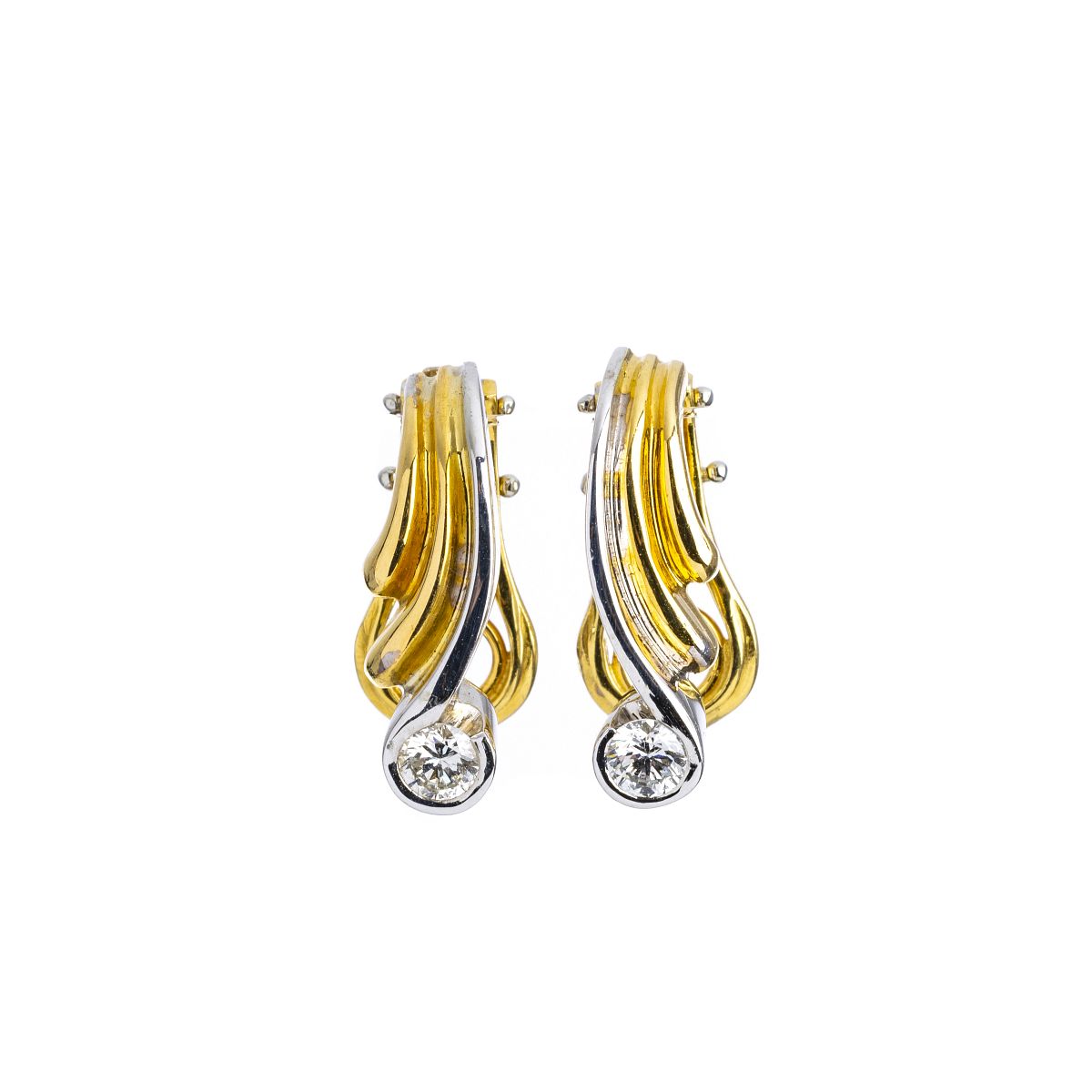 Ouro branco e amarelo, contrastes cigarra 800 e galo, com dois diamantes lapidação brillhante redondo com peso estimado de 0,34ct. Sinais de uso. Peso total:8,2g. Dim.:1,8cm.