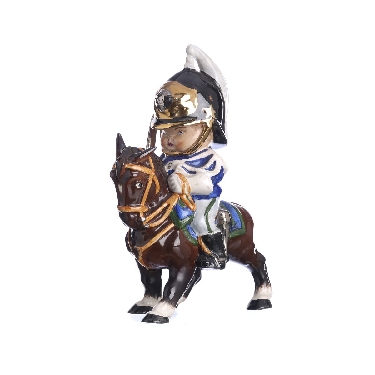Escultura em faiança de Sacavém, série 'Bébé' de Leonel Cardoso, decoração polícroma vidrada representando GNR a cavalo. Sinais de uso. Não marcado. Dim.: 21cm.