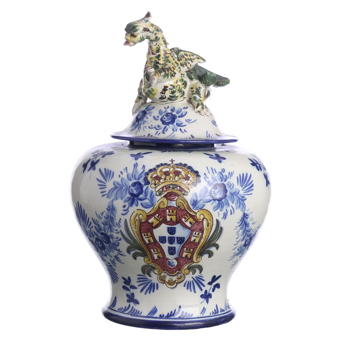 Faiança portuguesa da Fábrica de Santana, Lisboa, datada de 1944, decoração polícroma com Brasão de Armas Reais, tampa encimada por dragão. Dim.: 43 cm.