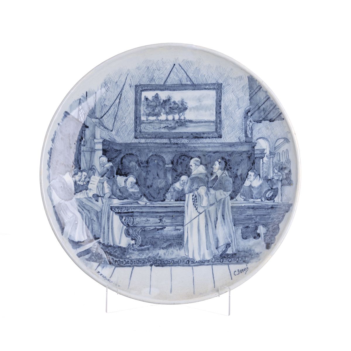 444. CARLOS BRANCO - Grande prato em faiança do Carvalhinho 'Frades jogando bilhar'