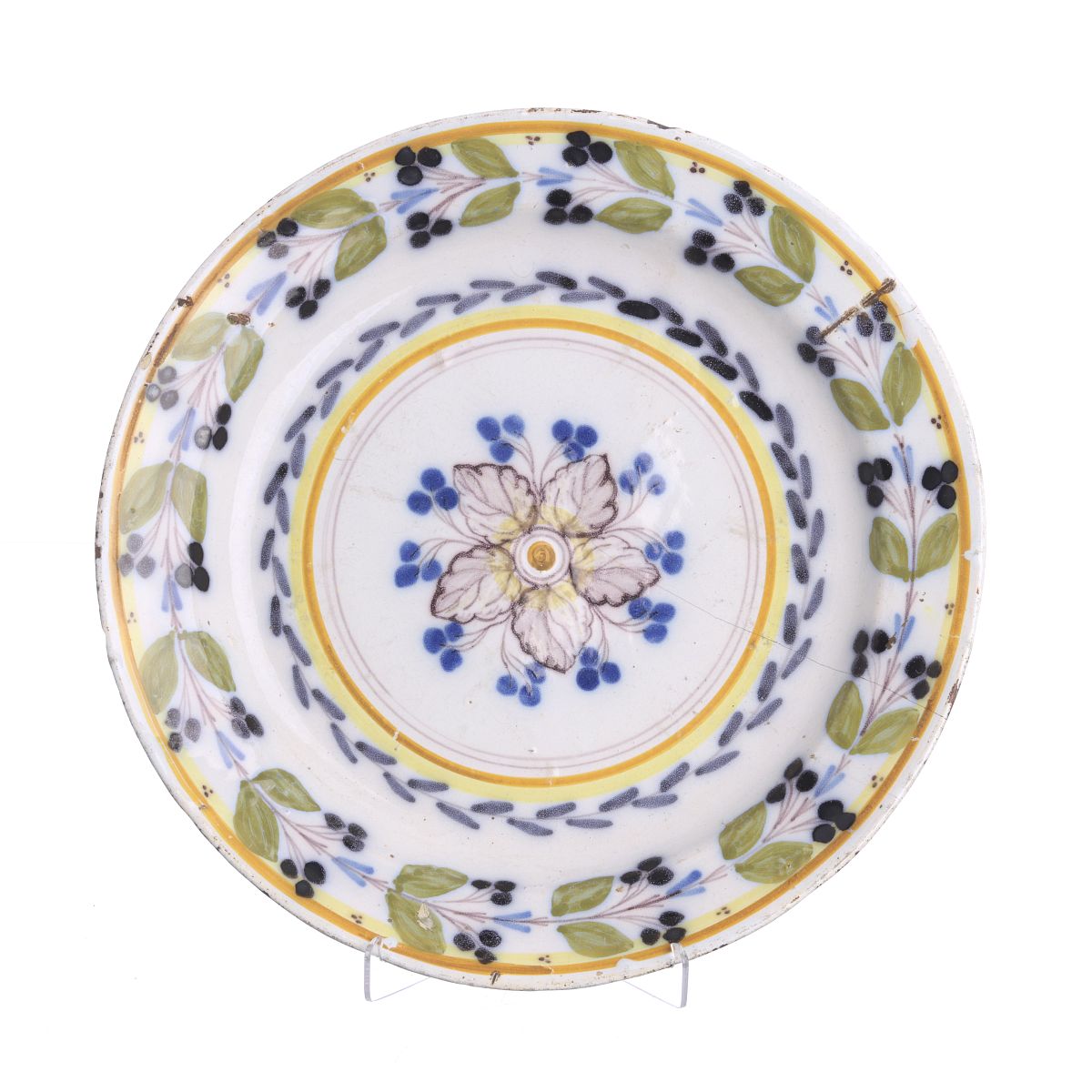 Faiança portuguesa atribuível a Estremoz, séc. XVIII/XIX, decoração polícroma vegetalista. Cabelos, pequenas falhas. Dim.: 34 cm.