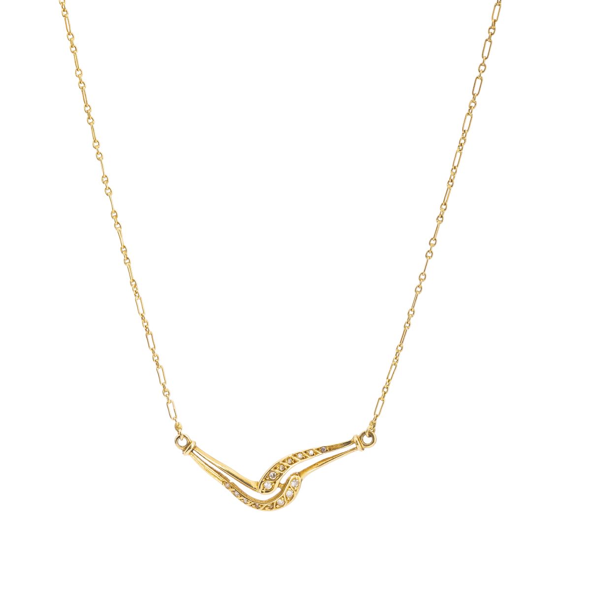 Ouro amarelo, contrastes veado 800 e galo, centro de colar com 15 diamantes lapidação brilhante redondo. Sinais de uso. Peso total:4,6g. Dim.fechada:21cm.