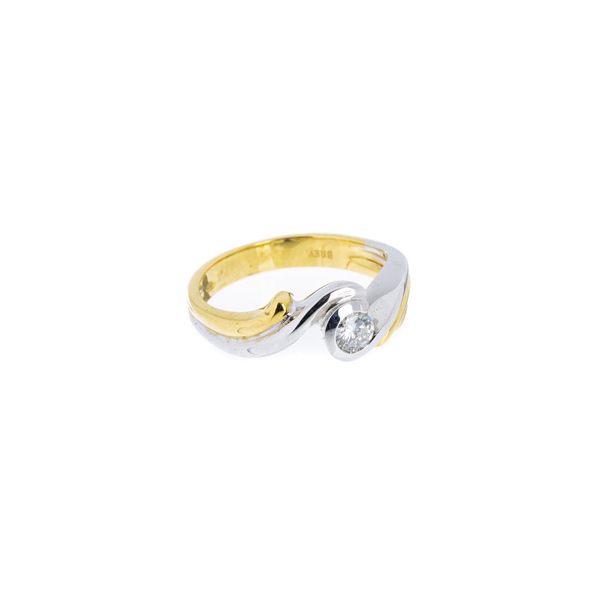 Ouro amarelo e branco, contrastes galo e veado 800, com 1 diamante lapidação brilhante redondo, pureza SI-P, cor I-K, com peso estimado de 0,22ct.. Peso total: 5,9g. Med.:13.