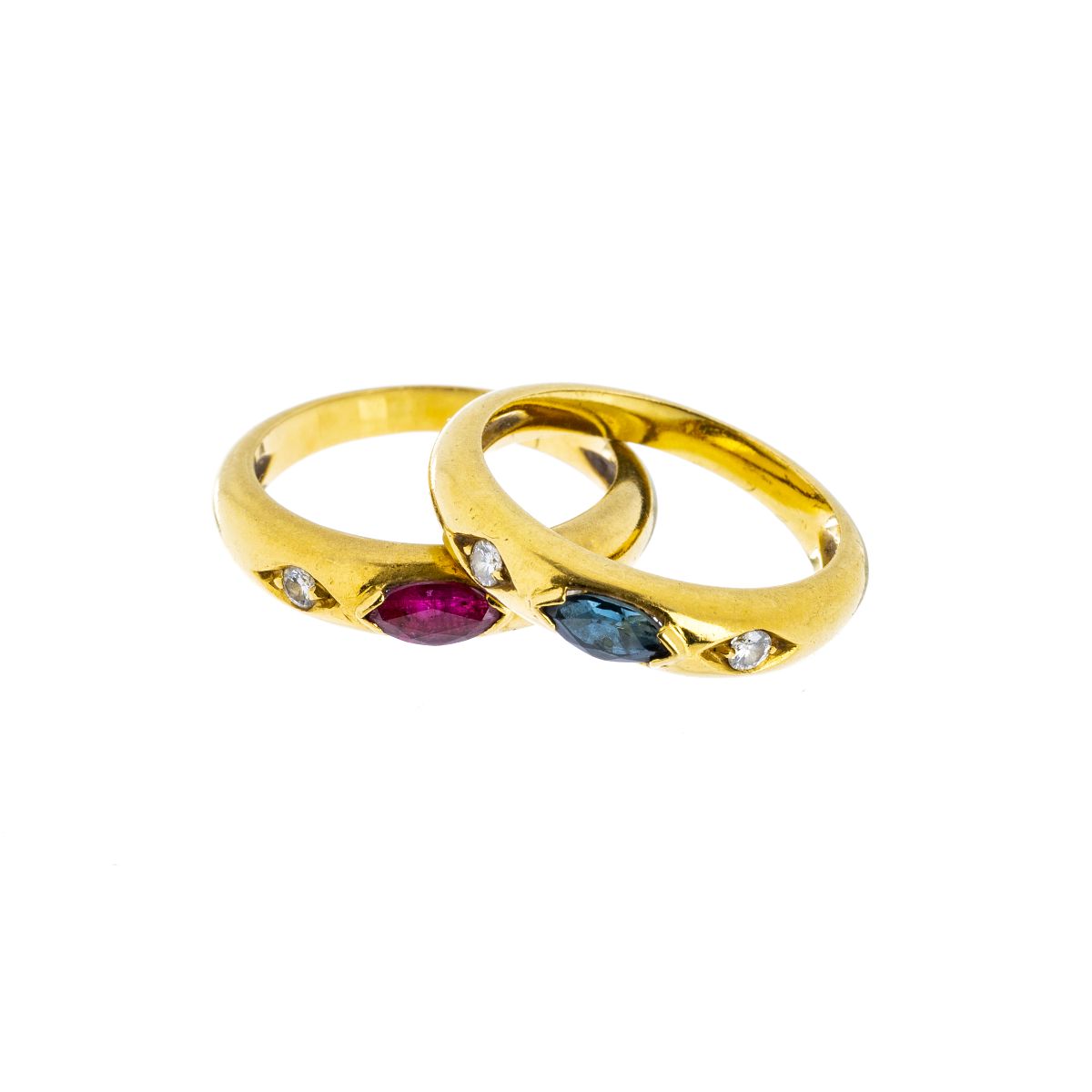 54. Dois anéis em ouro, rubi, safira e diamantes