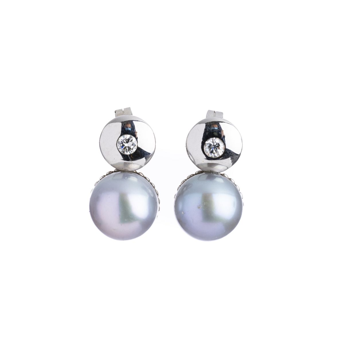 Ouro branco, contraste veado 800, com dois diamantes lapidação brilhante redondo, duas pérolas de cultura cinzentas com aprox.10,3mm. Sinais de uso. Peso total:8,5g. Dim.:1,8cm.