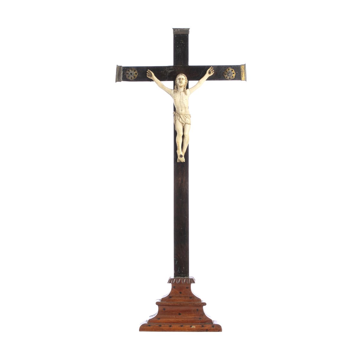 Escultura indo-portuguesa em marfim, séc.XVII, cruz e base em madeira, terminais em metal. Dim.: 71 cm; Cristo: 23 cm.