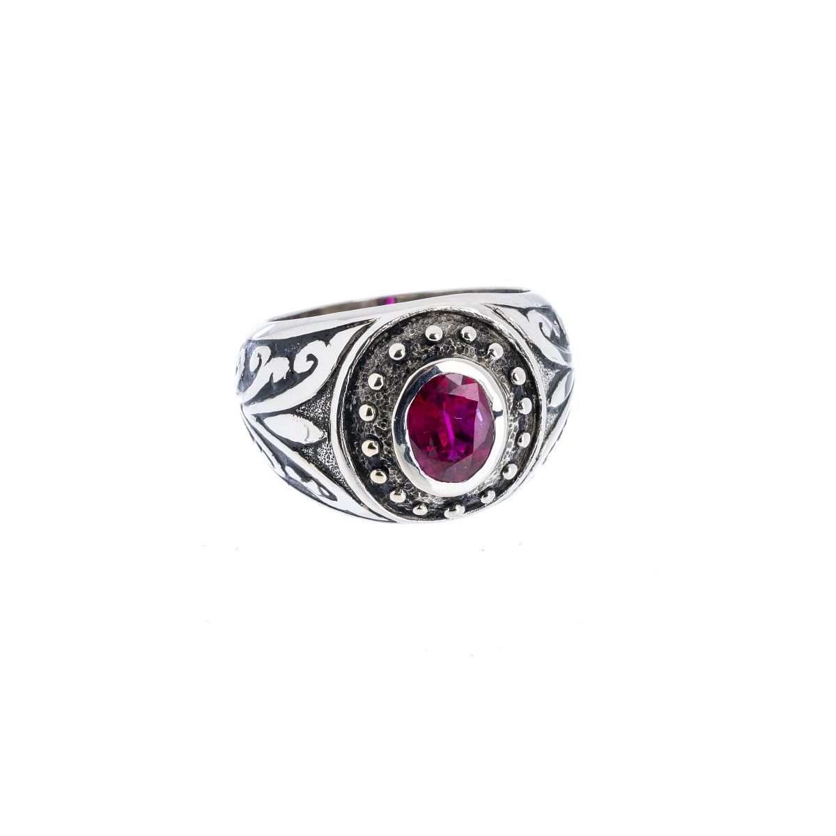 Ouro branco, veado 800, com um rubi oval com aprox. 8.5x6.5mm. Peso total: 15,3g. Med.:20.