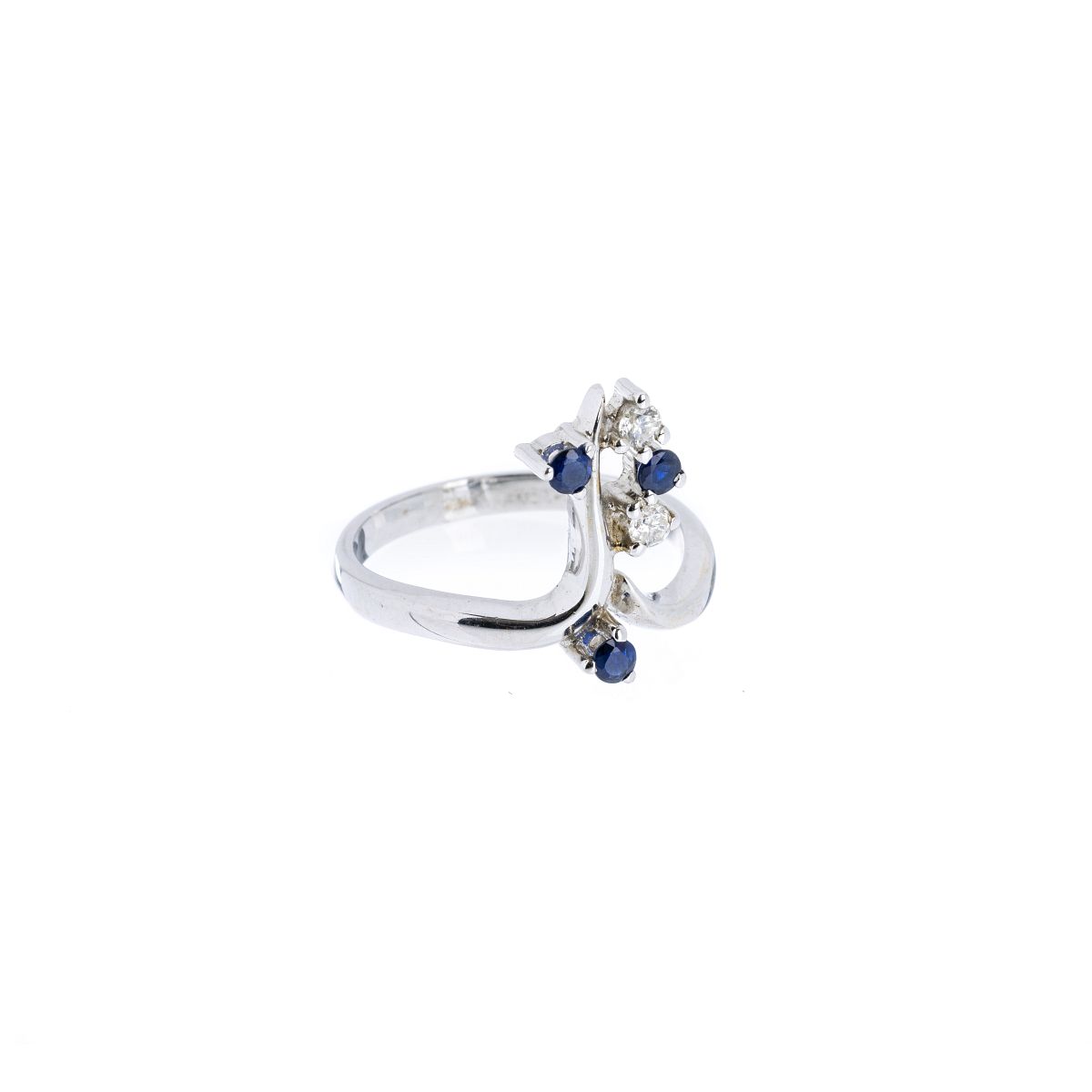 Ouro branco, contraste veado 800, com dois diamantes lapidação brilhante redondo com peso estimado total de 0,12ct, três safiras lapidação brilhante redondo. Sinais de uso. Peso total:4,9g. Med.:17.