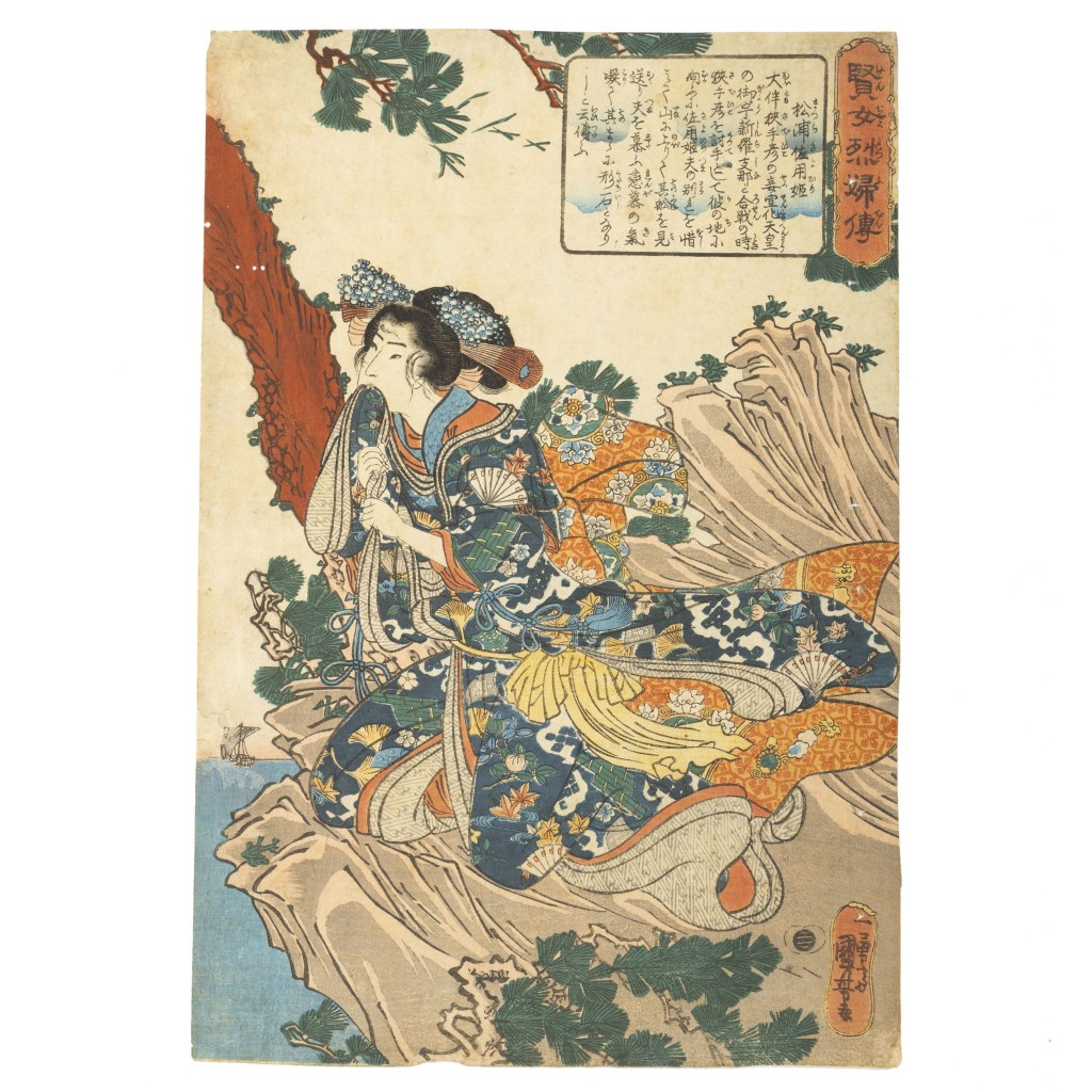 Japão, xilogravura colorida, datada de 1842, representando Princesa Sayo no Matsu-ura, mulher sábia representada, em 'Biografias de mulheres sábias e esposas virtuosas'. Sinais de uso. Dim.:36x24,5cm.