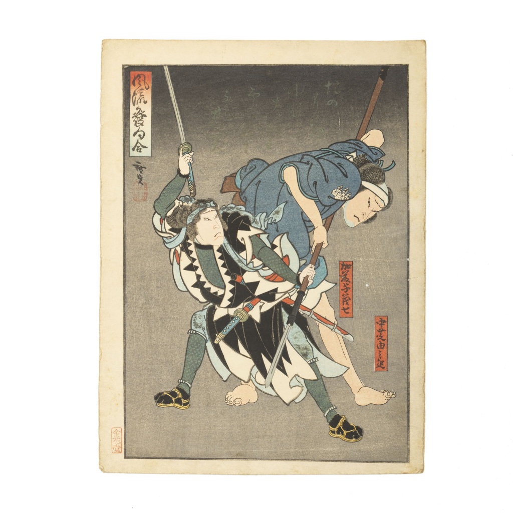 Japão, xilogravura colorida, representando Nakamura Tamashichi como Katô Yomoshichi a lutar, assinado, com selo. Sinais de uso. Dim.:26x19cm.