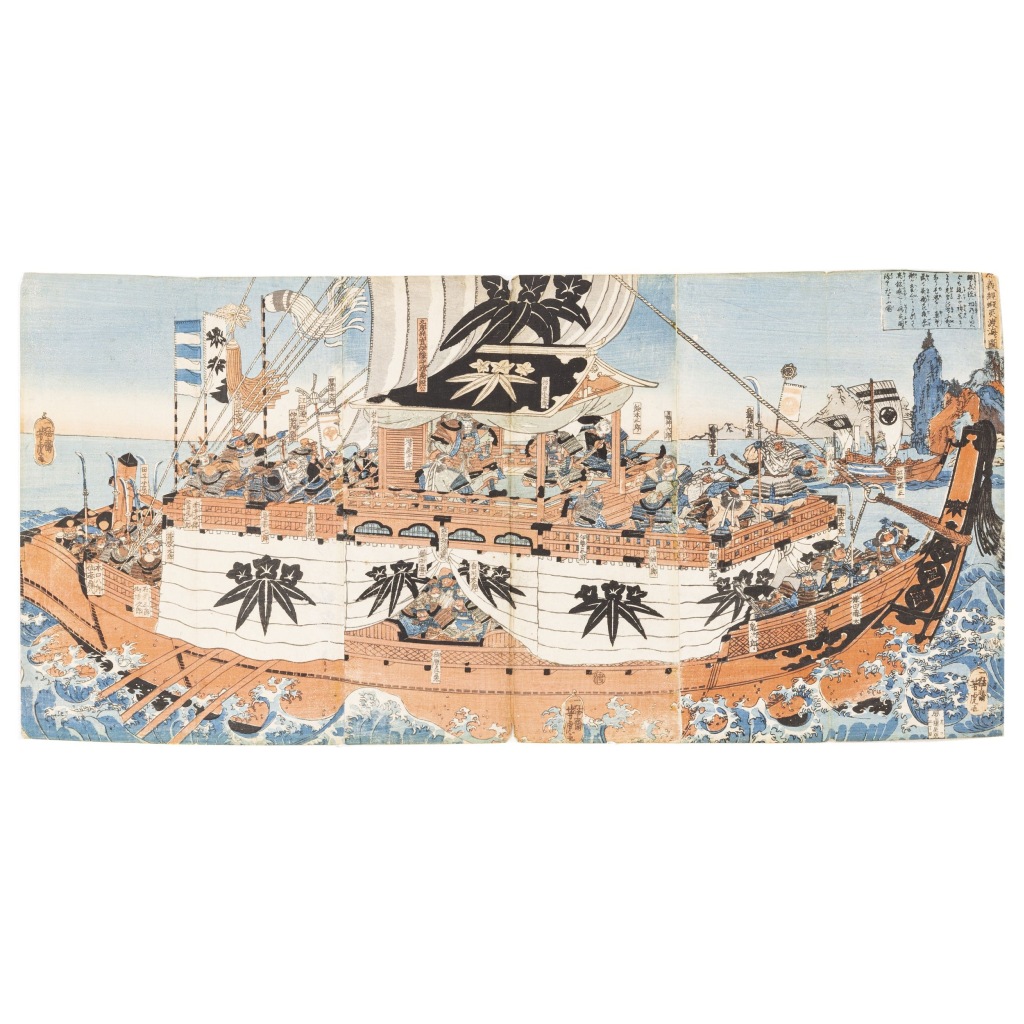 Japão, tríptico, xilogravuras coloridas, assinada Ichimôsai Yoshitora ga, datada de 1843-1847, representação de Minamoto Yoshitsune atravessando o mar para Ezo, editora Kazuxaya Iwazô (Iwakichi), selo: 'Hama'. Dim.:35x73cm.