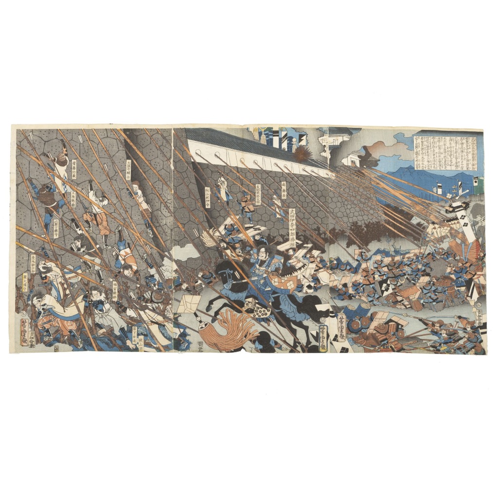 Japão, tríptico, xilogravuras coloridas, assinada Yoshitora ga, datada de 1864, editora Iseya Kanekichi, selo 'Rato 7 aratame', marca do cortador de blocos 'Katada Hori Chô'. Vide Catálogo Raisonné. Sinais de uso. Dim.:36x76cm.