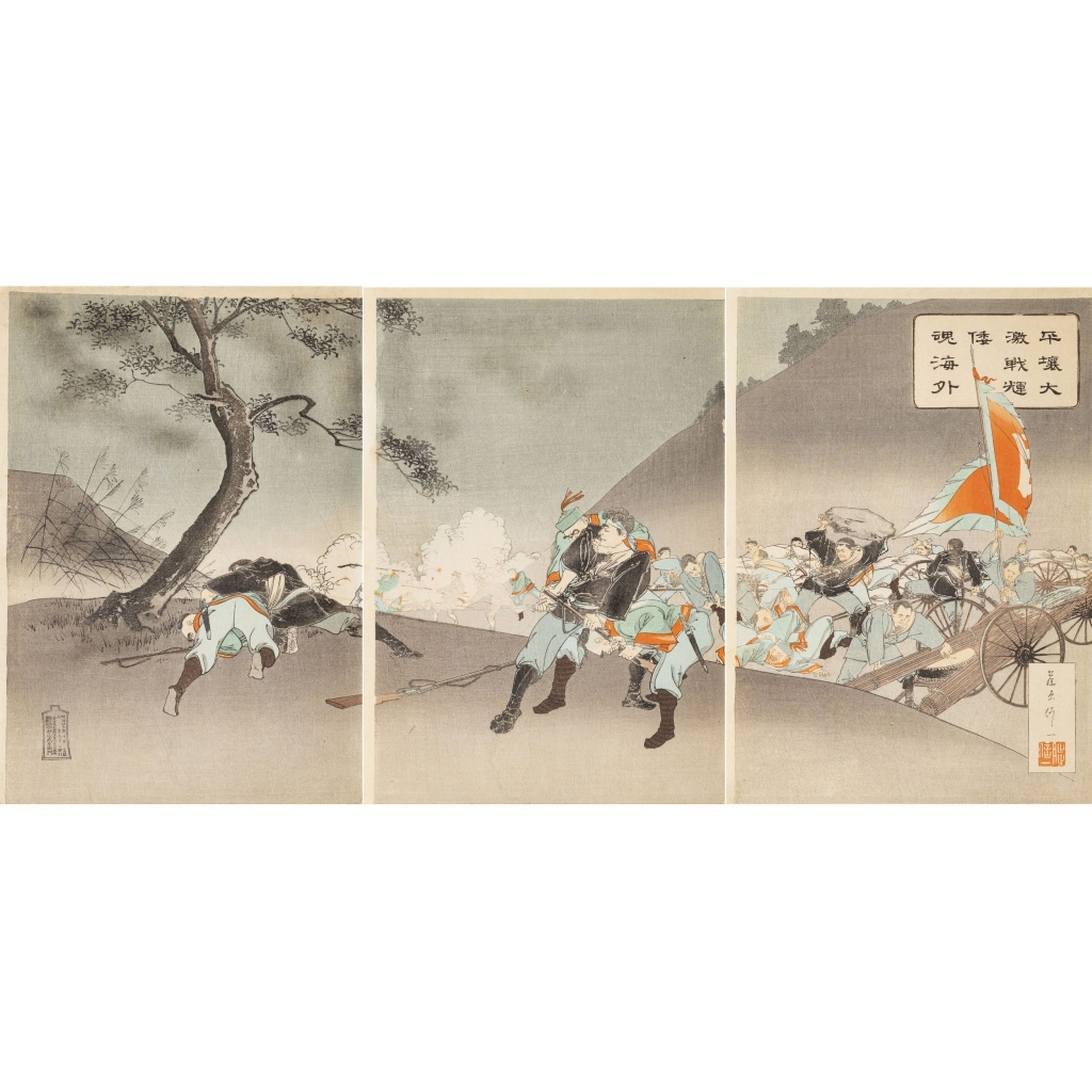 Japão, tríptico, xilogravuras coloridas, assinada Fujiwara Denichi, datada de 1894, Outubro, marca:'Fuji Denichi', representando luta feroz em Pyongyang, mostrando o espírito japonês para o mundo, editora Akiyama Buemon. Dim.:37x25cm (cada).