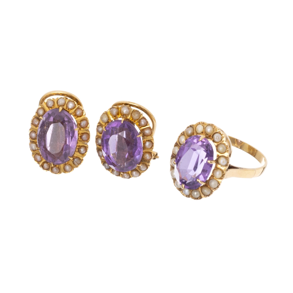 Ouro amarelo, com três ametistas brilhantes ovais e micropérolas. Sinais de uso. Peso total:10,9g. Dim.:2cm, med.:14,5. Ao abrigo DL 120/2017.