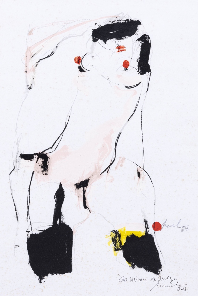 Técnica mista sobre papel, assinada e datada de 1984, com dedicatória. Ligeiras manchas de humidade. Dim: 60cm x 40cm.