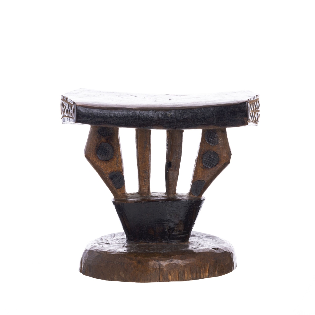 Angola, ínicio do séc.XX, madeira entalhada, vazada e incisa com motivos geométricos e pirogravados. Sinais de uso. Dim.:11,5 cm