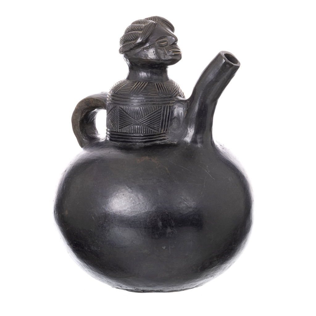 Angola, séc.XX, primeira metade, cerâmica negra moldada, decoração geométrica incisa, topo com figura. Dim.:26,5 cm