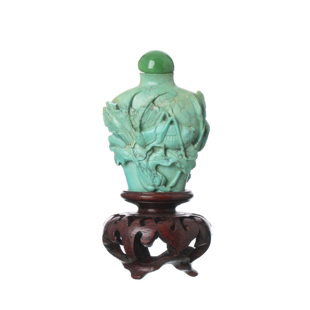 China, República, turquesaesculpida com insetos e flores, tampa em jade. Base de madeira vazada. Sinais de uso. Dim.:7,8cm.