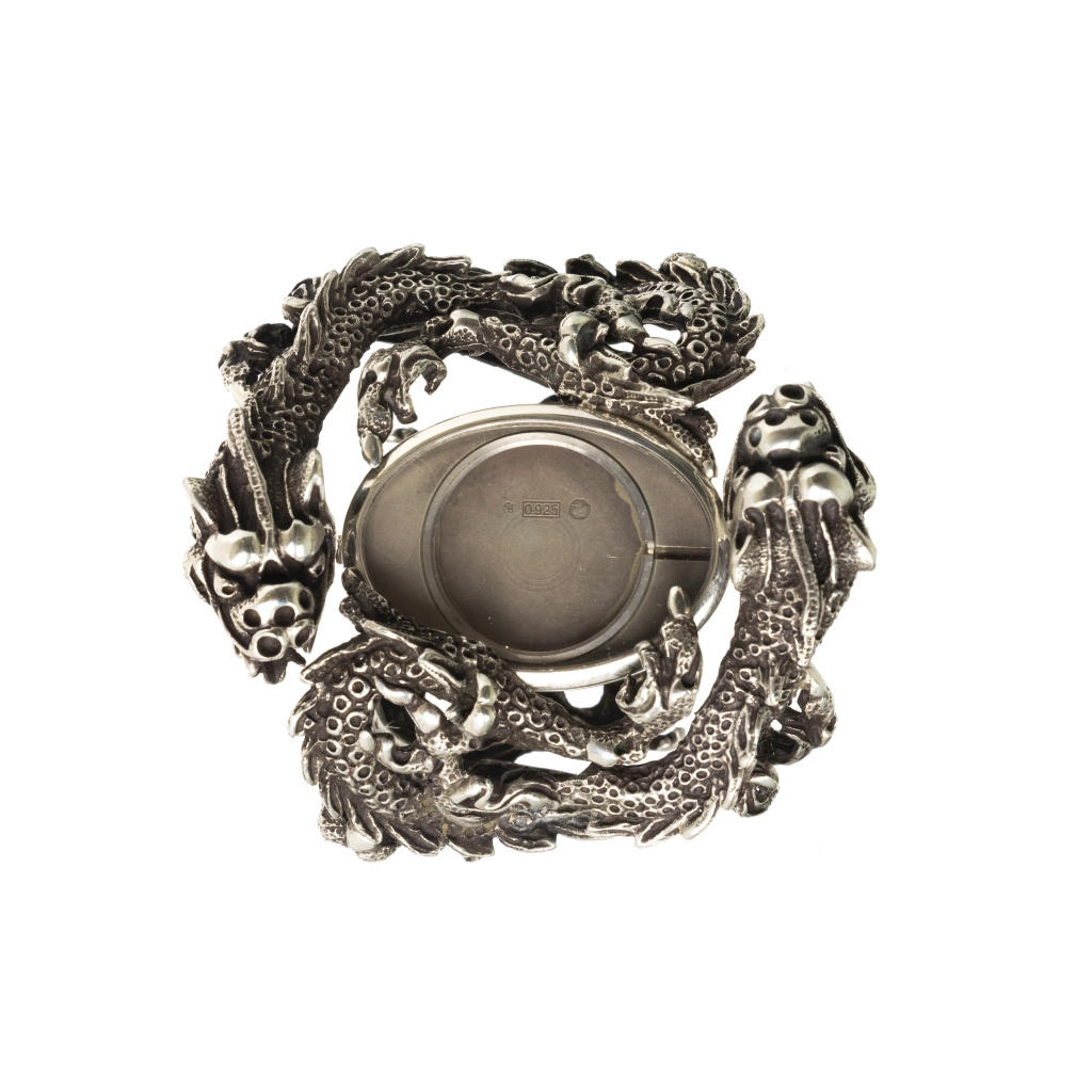 China, séc.XX, prata moldada e cinzelada em forma de dragões enrelaçados. Sinais de uso. Dim.: 8x6,5cm. Marcada. Peso total: 179,23gr. Ao abrigo do Decreto-Lei nº120/2017.