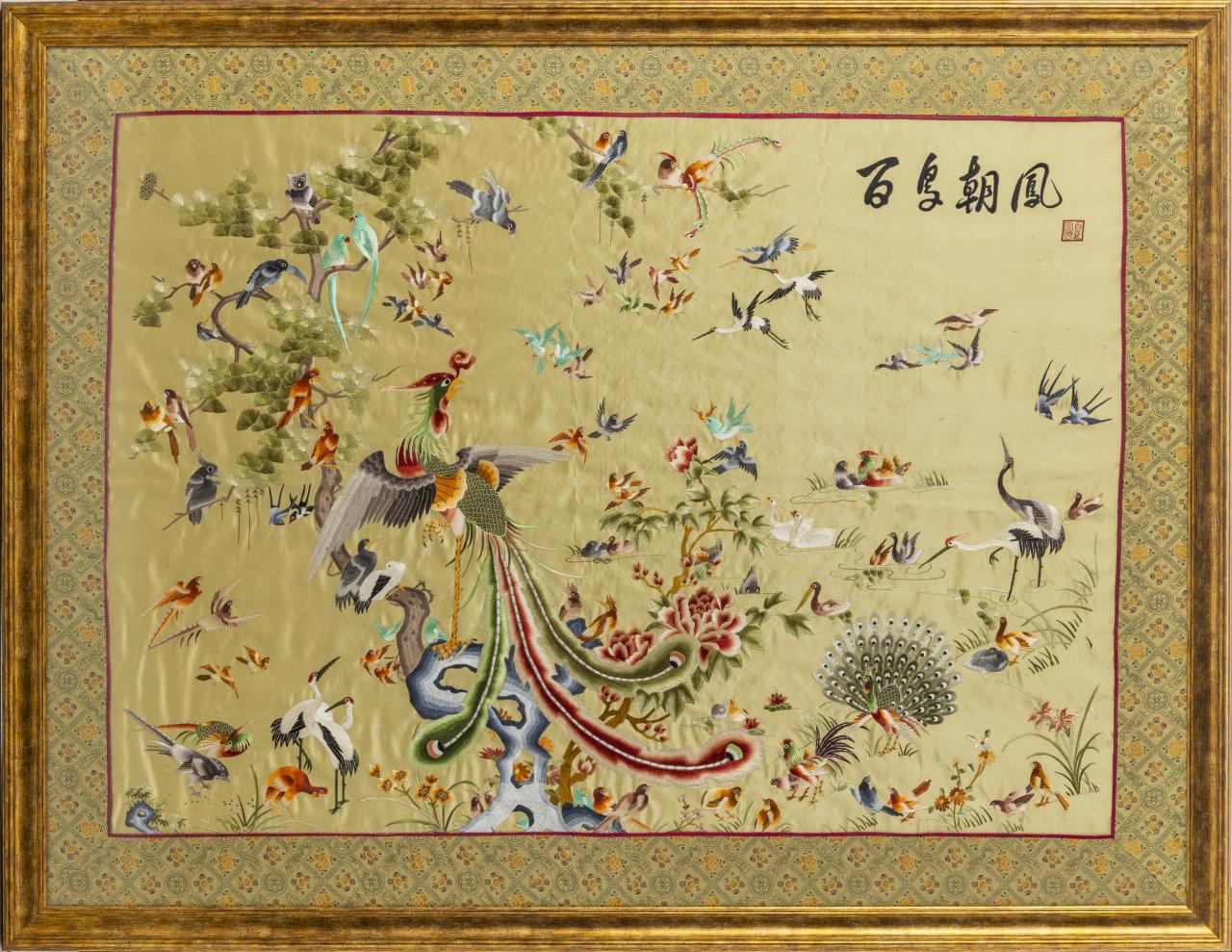China, séc XIX, bordado em seda, representando aves e fênix. Assinado. Sinais de uso. Dim.:86x114cm