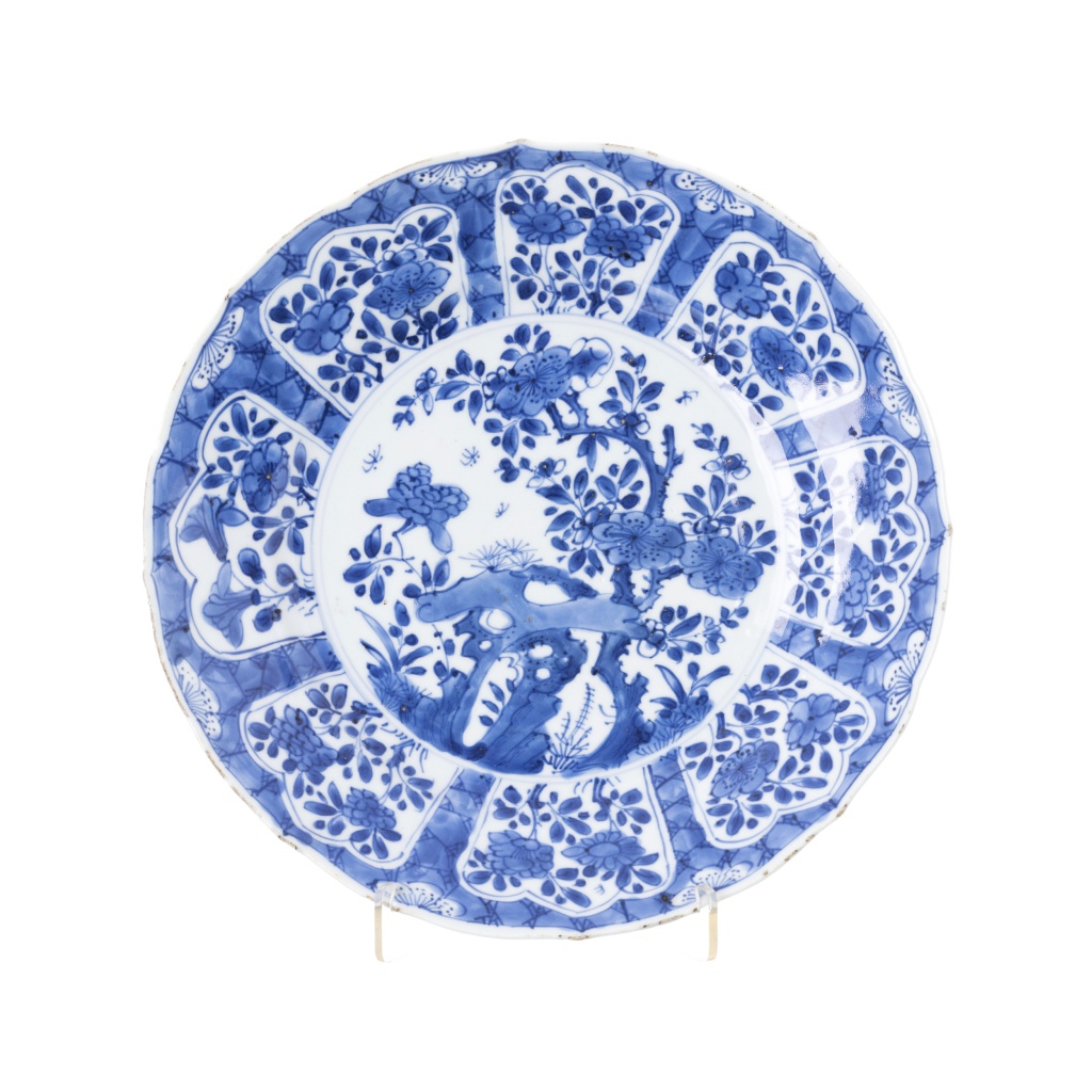China, Kangxi, decoração a azul e branca com reservas florais, aba recortada, verso decorado. Marca na base. Sinais de uso, mínimas esbeiçadelas no bordo. Dim.:28cm.