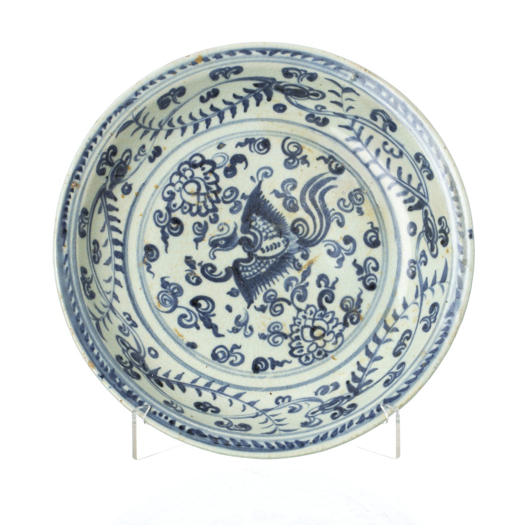 China, Swatow, Dinastia Ming, reinado de Wanli (1563-1620), porcelana moldada, decoração a azul com fênix, verso decorado. Sinais de uso. Dim.:26cm.