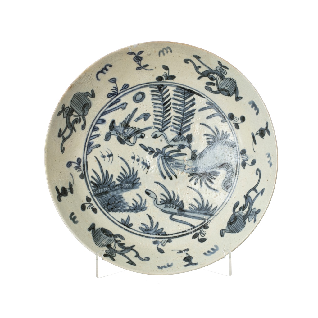 China, Swatow, Dinastia Ming, Wanli 1563-1620), decoração a azul, grous entre motivos vegetalistas. Sinais de uso, pequeno restauro. Dim.:28cm.