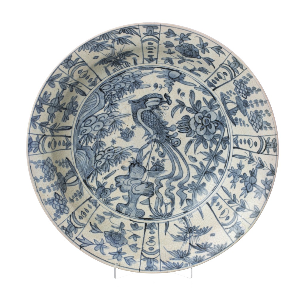 China. Dinastia Ming, Wanli 1563-1620), porcelana Swatow vidrada azul e branco, com motivos vegetalistas e fênix ao centro, verso decorado. Pequeno cabelo. Dim.:38cm.