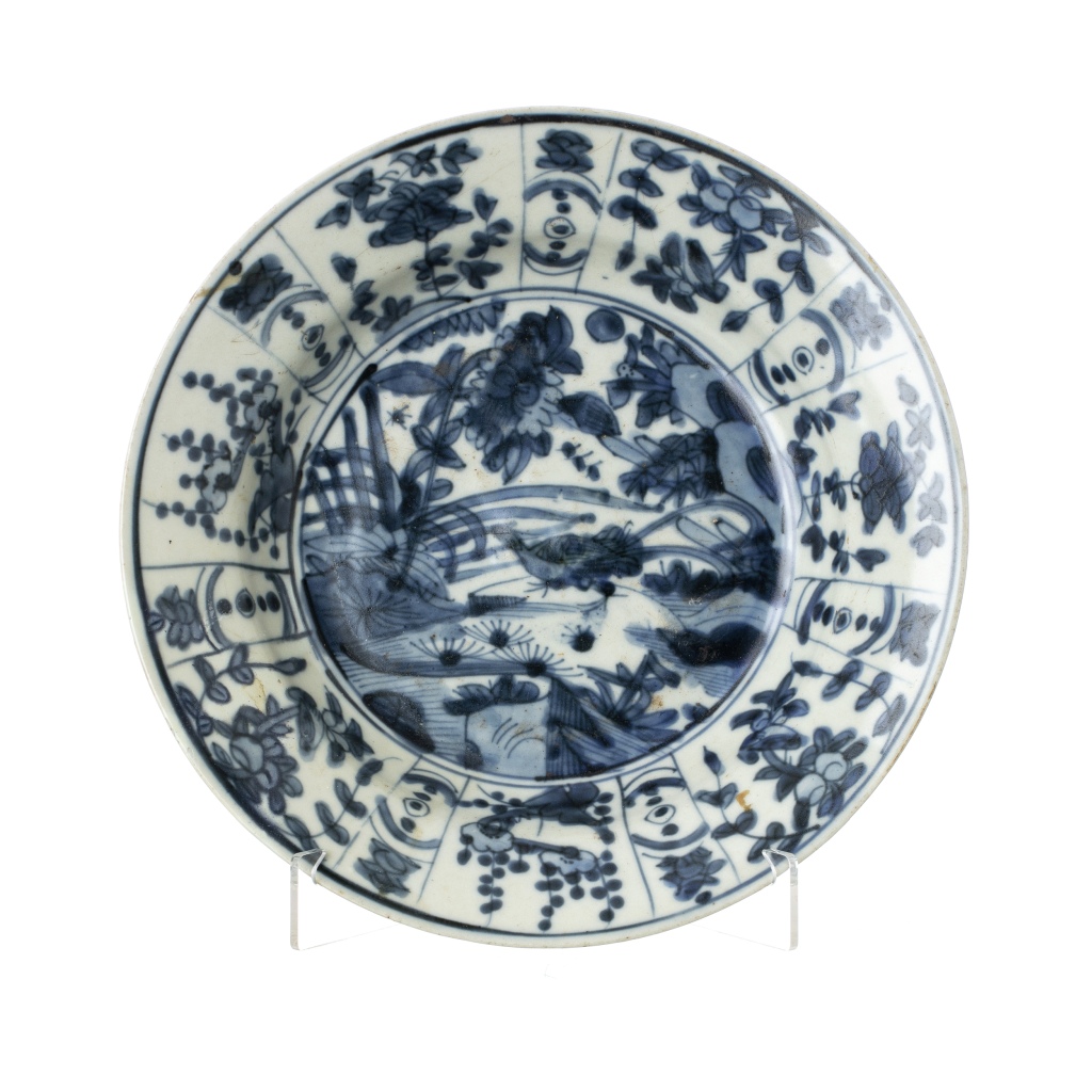 China, Swatow, Dinastia Ming, Wanli 1563-1620), decoração a azul, de reservas florais e faisão entre motivos vegetalistas. Sinais de uso, cabelo. Dim.:28cm.