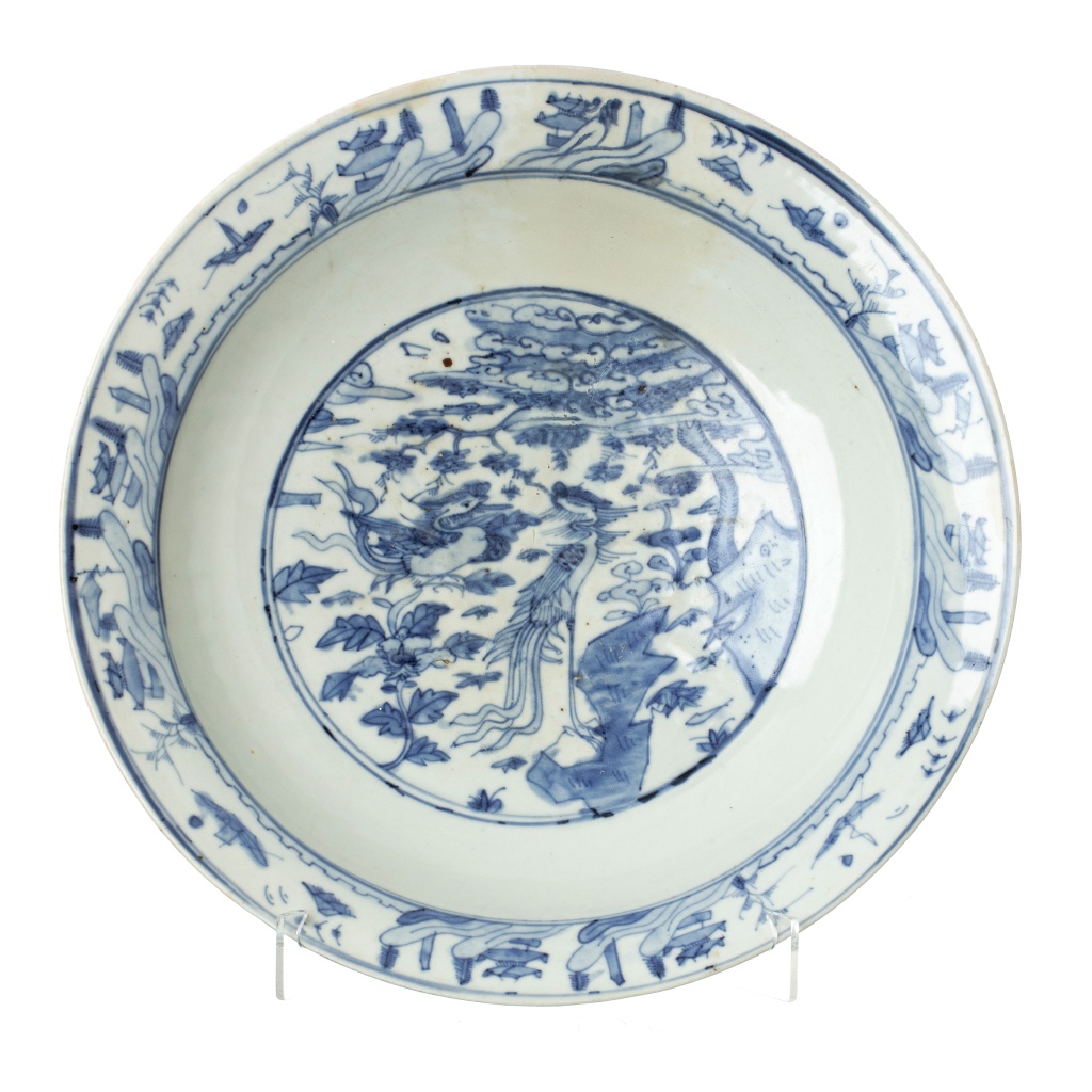 China, Swatow, Dinastia Ming, Wanli 1563-1620), decoração a azul, decoração com fênixes entre motivos vegetalistas, bordo com pagode e barcos fluviais, verso decorado. Cabelo, pequeno restauro. Dim.:41,5cm.