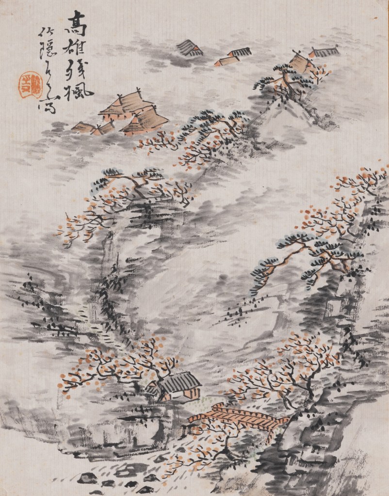 Japão período Meiji, pintura a tinta da china e aguarela sobre papel representando paisagem com nevoeiro e casas. Caligrafia e selo. Dim.:22x16,5cm.