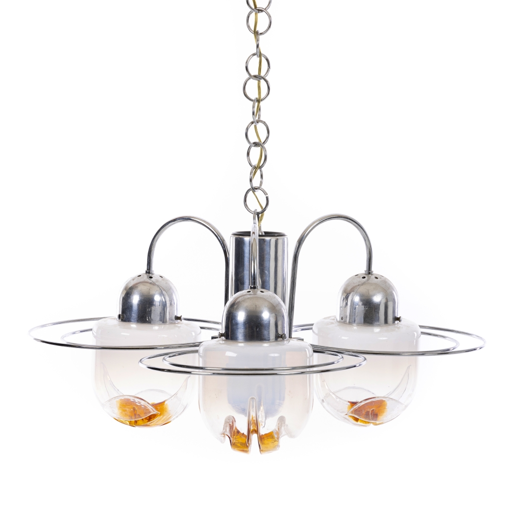 Italia, c.1970, em metal cromado e globos em vidro Murano opalescente. Electrificado. Sinais de uso. Dim.: 64 cm.