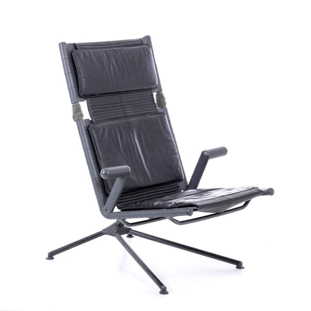 Itália, 1988, fabrico de Magis, em metal lacado, material plástico e pele. O módulo de assento pode girar e transformar o apoio de cabeça em um apoio para os pés. Dim.: 101x88x78,5 cm.