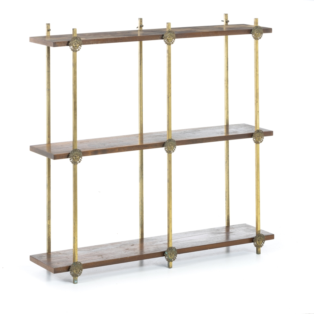 França, c.1960, restutura em metal dourado decorada com rostos de medusa, três prateleiras em madeira. Ligeira oxidação. Dim.:96,5x96x23cm.