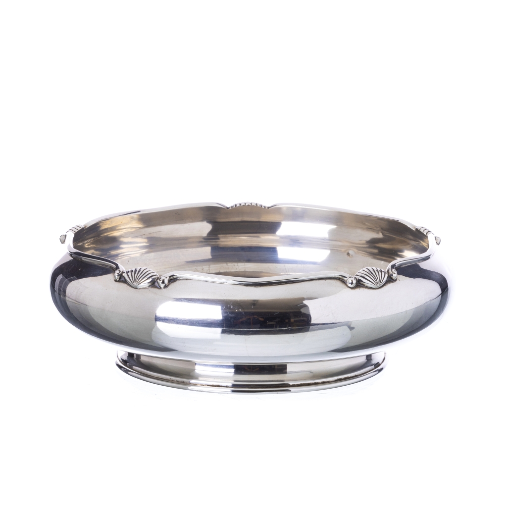 Prata, contraste águia 916 (1938-1984), 1º título, marcada 'Joalharia do Carmo, Lisboa', bordo recortado com concehados em relevo. Mínimas amolgadelas. Peso aprox.:905g. Dim.:27cm.