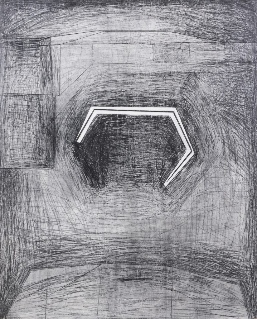 Grafite sobre madeira preparada a acrílico, assinada e datada de 1988 no verso. Exposto na Fundação Calouste Gulbenkian, CAM, Pedro Calapez, 'Desenhos sobre madeira' 1989, encontrando-se reproduzida no respectivo catálogo. Dim.: 155x125 cm.