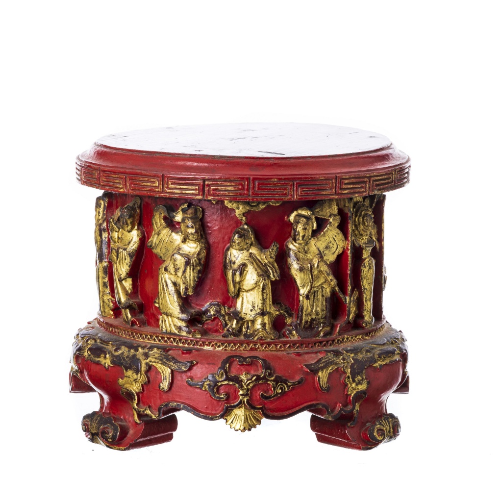 185. Base chinesa com divindades em madeira lacada