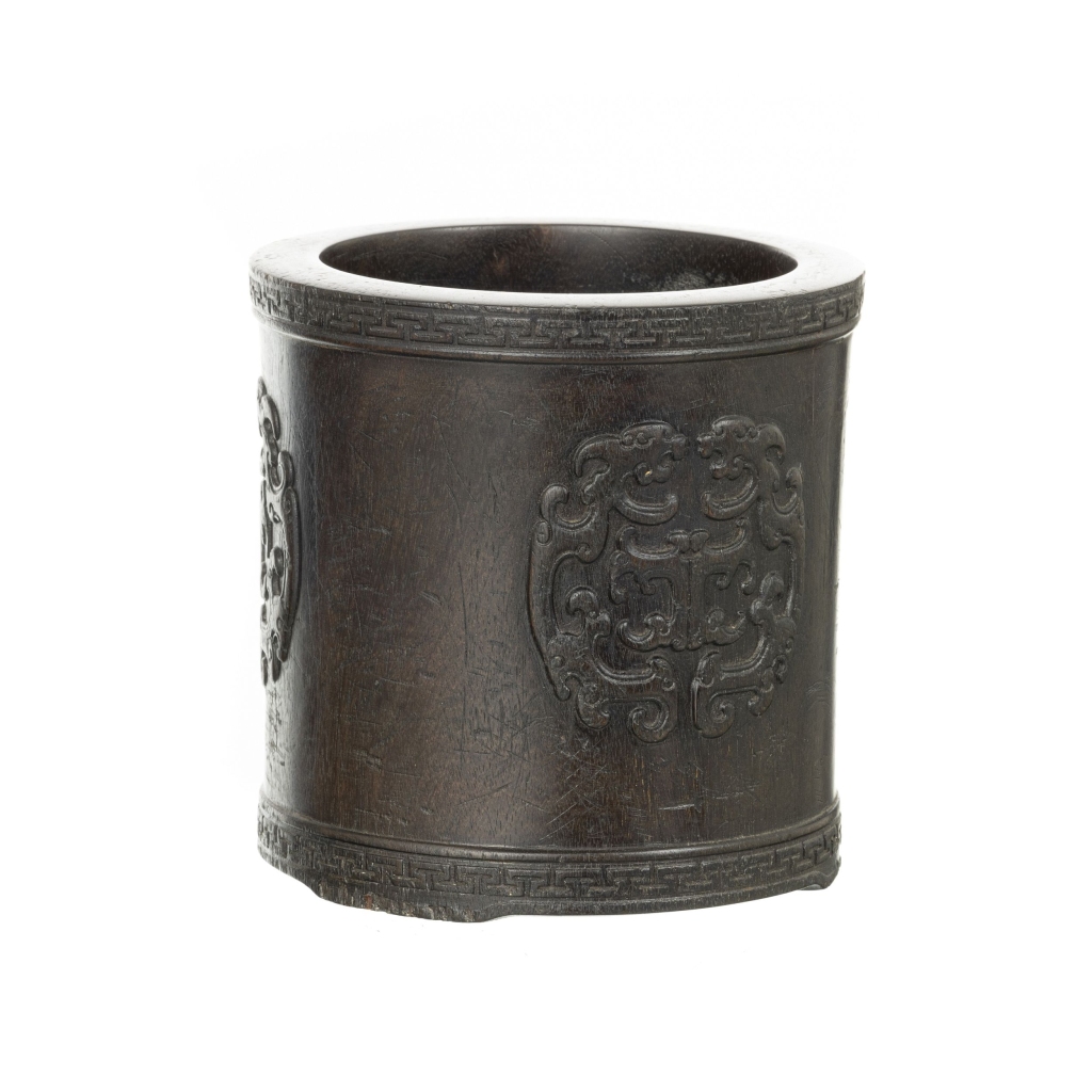 China, Minguo, em madeira zitan, decoração relevada com dragões estilizados. Pequenos defeitos na base. Dim.:13cm.