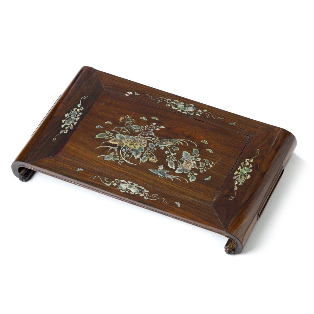 China, Minguo, em tamarindo entalhado, decoração de embutidos em madrepérola com aves entre flores. Dim.: 4,5x39,5x24 cm.
